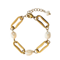 This gold-plated steel bracelet combines the robustness of metal links with the delicacy of pearls to create an accessory of timeless elegance. The large , elongated links give a contemporary and structured feel to the piece, while the interspersed pearls add a classic and sophisticated touch.
