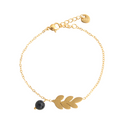 Esta pulsera de acero con baño de oro presenta un diseño elegante y naturalista, adornado con un colgante en forma de espiga y una intrigante bola de lava. La espiga, cuidadosamente cortada en oro, simboliza la paz y la prosperidad, mientras que la bola de lava negra añade un contraste audaz y terrenal al brillo suave del oro.