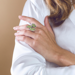 Descubre la armonía de la elegancia con nuestro anillo elástico, una expresión de estilo sin esfuerzo y comodidad inigualable. Este anillo, diseñado para adaptarse a las tallas 14-20, presenta una exquisita combinación de aleación de metales antialérgicos, un baño final de rodio y chips de olivina natural.